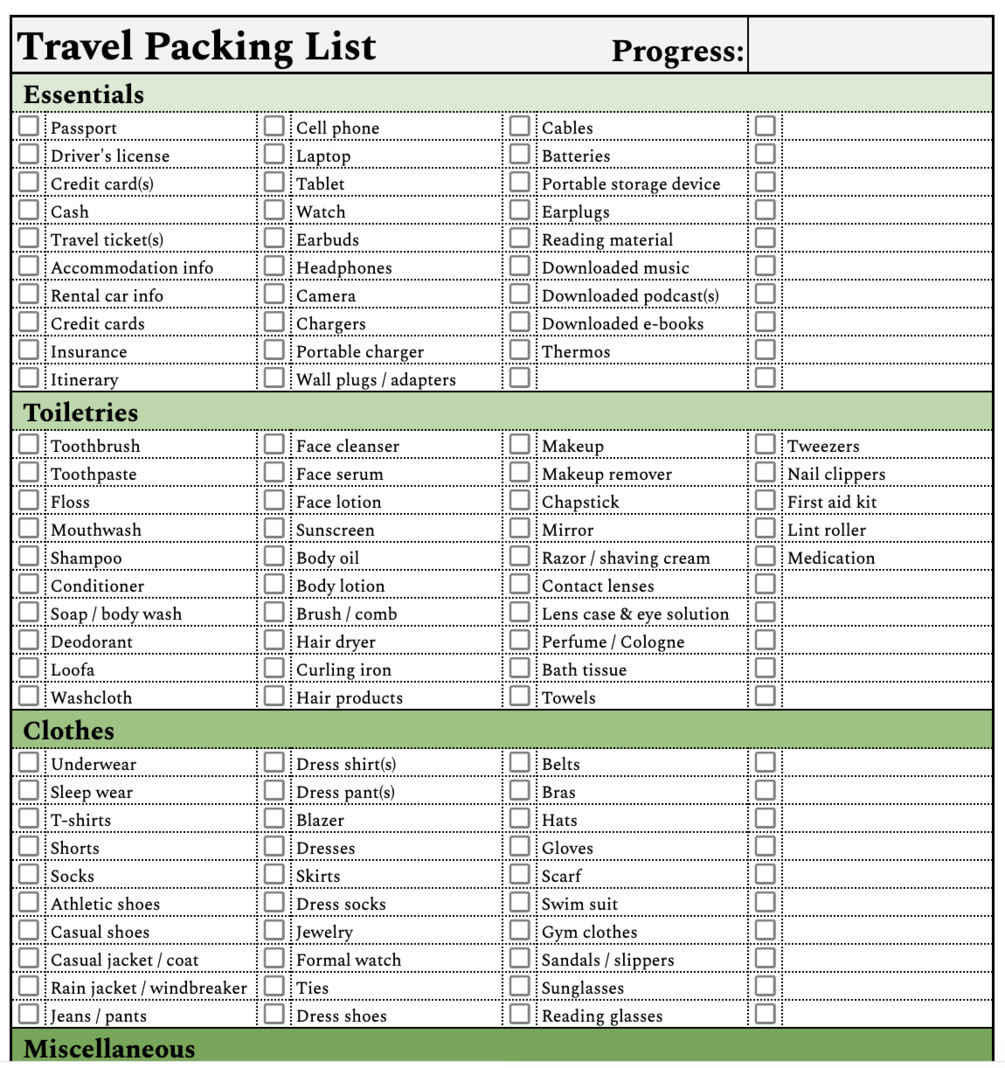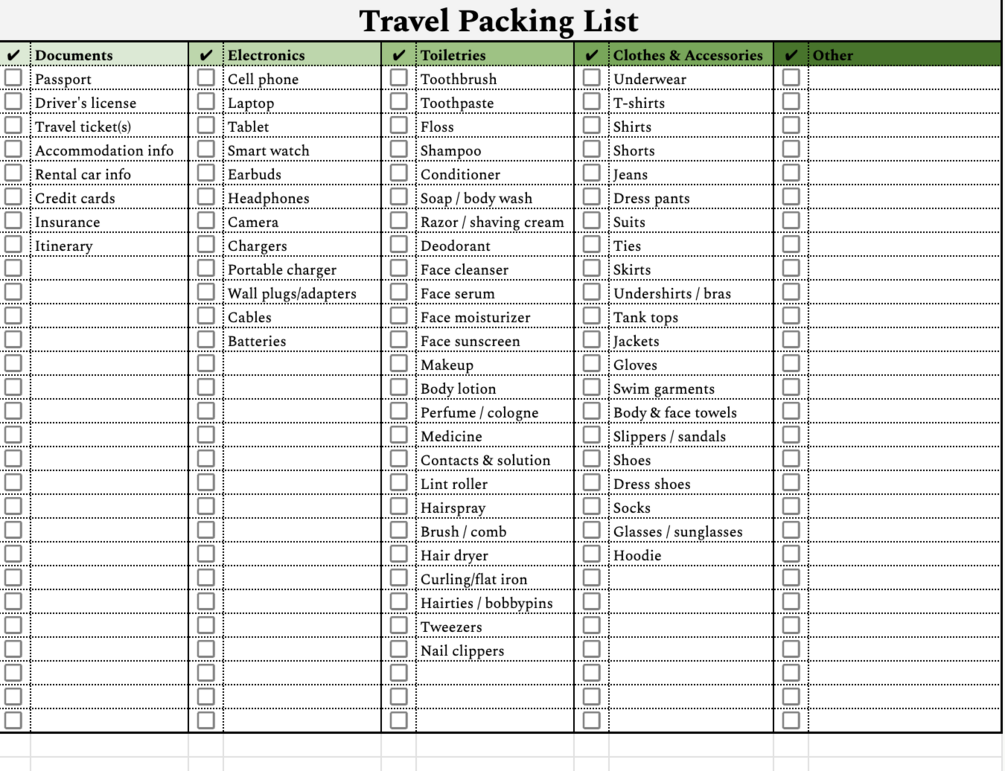 This is a spreadsheet to keep track of your packing list for your apartment and when you travel.